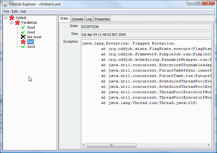 Oddjob jobs are arranged in a tree like hierarchy with an Oddjob job at the root. Only some jobs can have children, and only some jobs can have more than one child. Our root Oddjob job can only have one child.