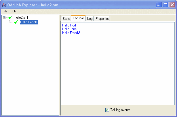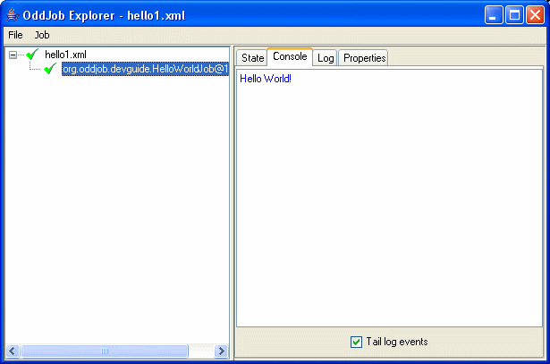 $ java -jar run-oddjob.jar -cp examples/classes -f examples/devguide/hello1.xml