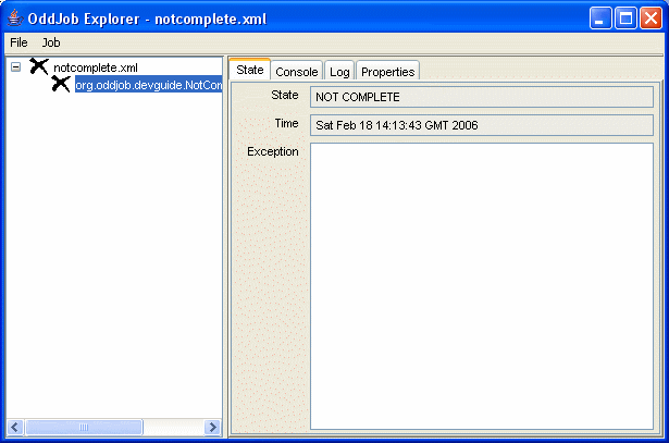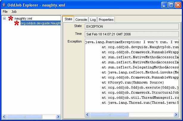 Oddjob will catch all Throwables during job execution and set the job state to Exception. Let see with an example.