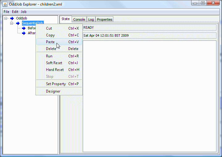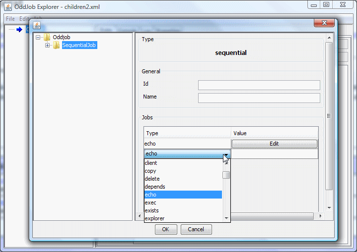 Next create a new sequential child of Oddjob, and create two echo jobs. Echo jobs just echo some text to the console.