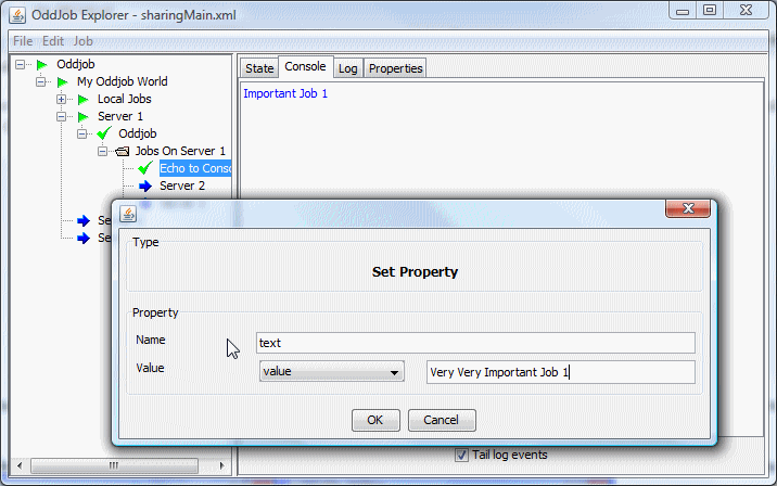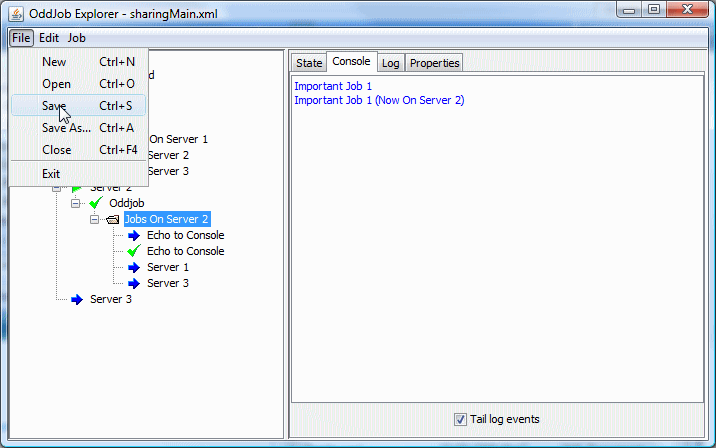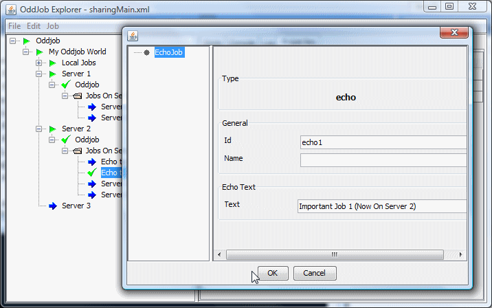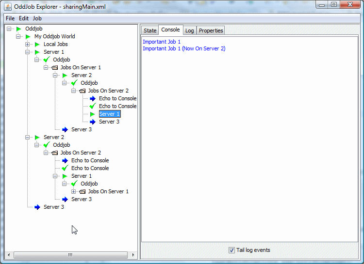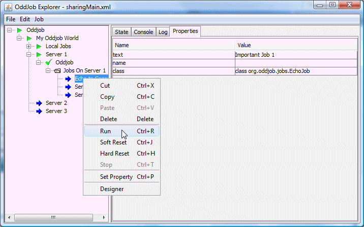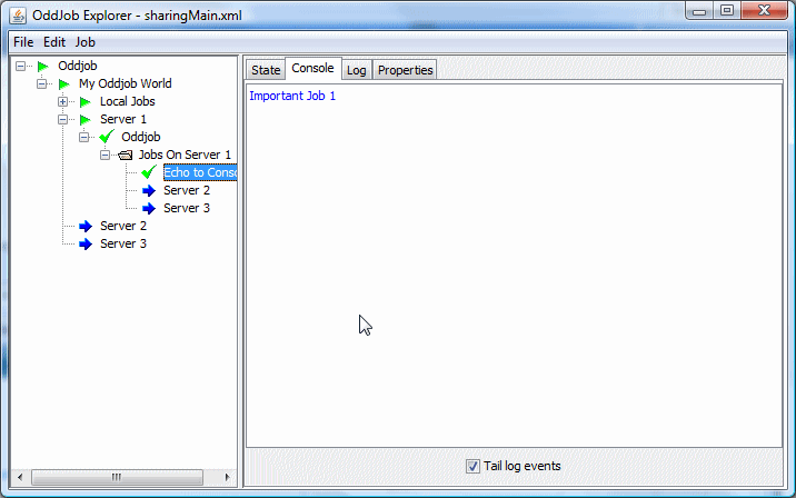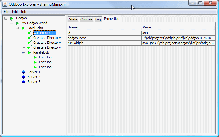 The job that provides the sharing functionality is the server job. This job shares the local jobs from the given root job down. In this case the root job is a nested Oddjob called Server Jobs.