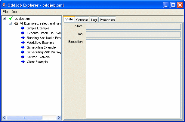 Oddjob Explorer is the primary method for monitoring and controlling jobs in Oddjob. To get started with Oddjob Explorer, we must open a configuration file containing the jobs we want Oddjob to run. Let's take a look at the examples shipped with Oddjob.