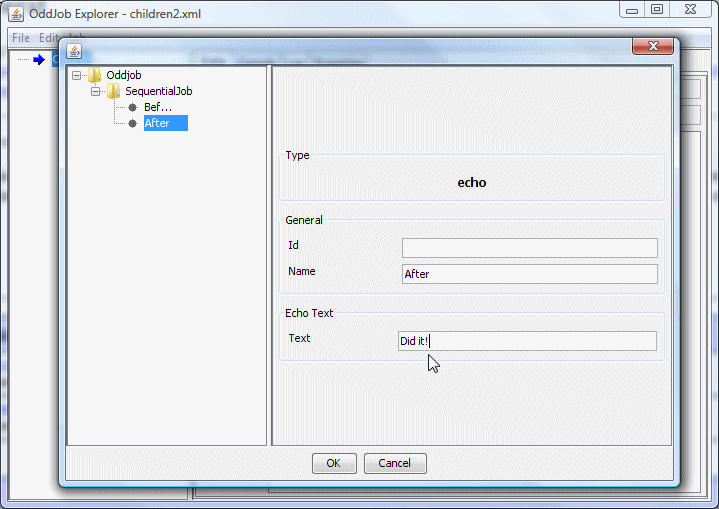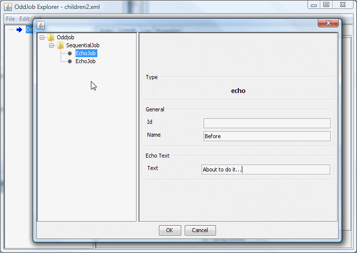 Next create a new sequential child of Oddjob, and create two echo jobs. Echo jobs just echo some text to the console.
