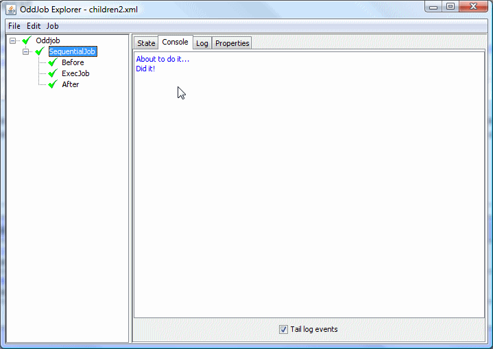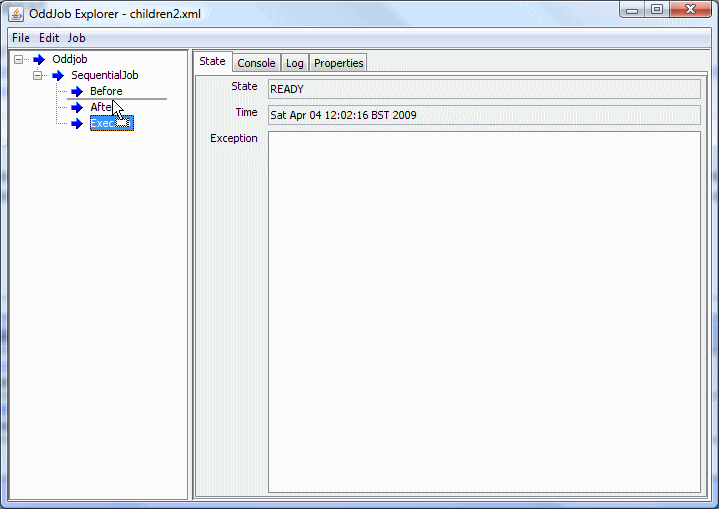 To demonstrate a sequential series of jobs lets change the Oddjob configuration we created in the previous section so that our ExecJob is surrounded by some useful information jobs.