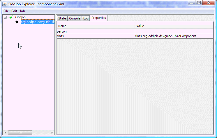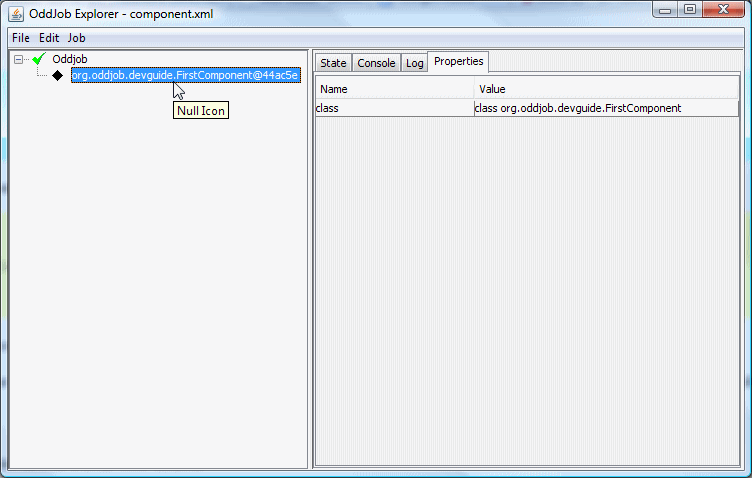 Because our component isn't Runnable, Oddjob isn't treating it as a job, so you get a boring icon and you can see some properties - but not much else.