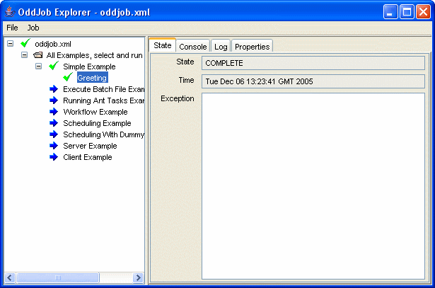 Our folder contains a lot of blue arrows. These are jobs that are ready to run. Since our folder is not shared on a network, the only way these job are going to run is if we run them manually. Let's run the first job 'Simple Example'. Select the node and then select the Job menu and select Run. The blue arrow changes to a green tick but also the job now has a child, and that is also a green tick. What happened? The job we ran was another Oddjob job, preconfigured with the name of the file containing our example job. This Oddjob job loaded the example job and this time ran it (because it wasn't in a folder).