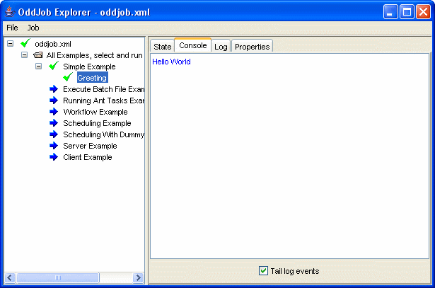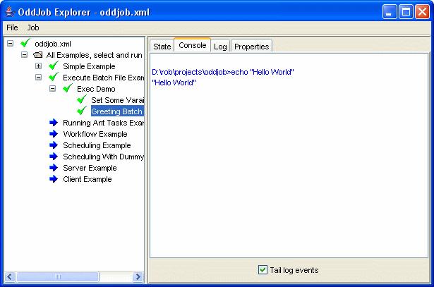 This example demonstrates executing a batch file from Oddjob and introduces us to using sequences of jobs and variables.