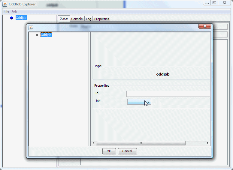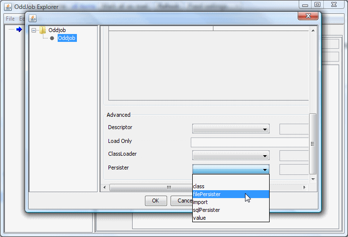 So how do I explain... Oddjob is a job that loads a configuration, and what we are editing is that configuration, not the configuration for Oddjob itself. There is a persister property on the Oddjob that Oddjob Explorer has created, but Oddjob Explorer doesn't let us set that. The reasoning behind this is that most of the time Oddjob will be running on a server and so Oddjob will need to be configured via some kind of configuration file, and what's a great way of configuring things? Why Oddjob of course.