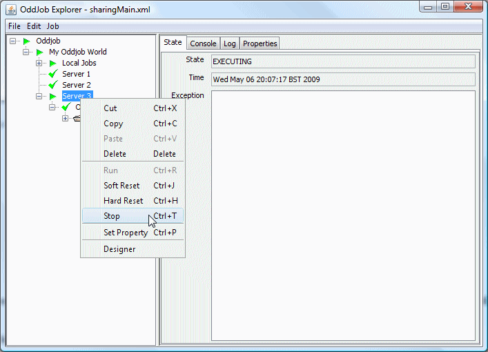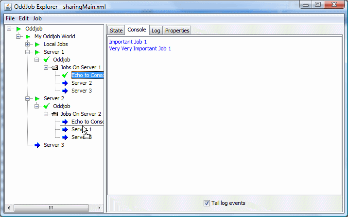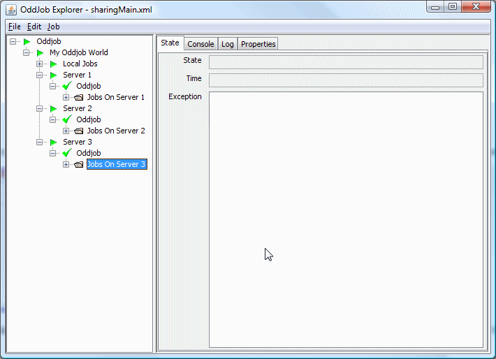The job that provides the sharing functionality is the server job. This job shares the local jobs from the given root job down. In this case the root job is a nested Oddjob called Server Jobs.